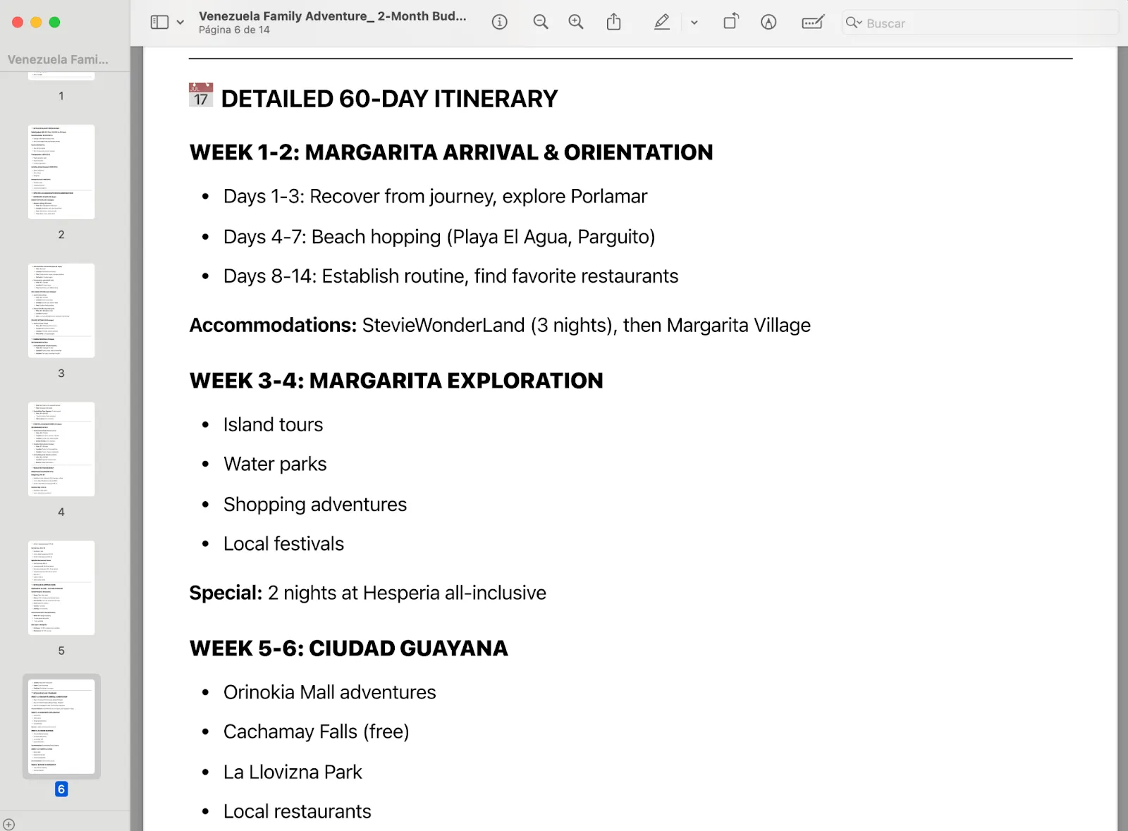 The model's research covered current prices, emergency contacts, health recommendations, and nuanced money management tips specific to Venezuela's infrastructure challenges. Each day was mapped with appropriate pacing for families, including downtime and kid-friendly activities.