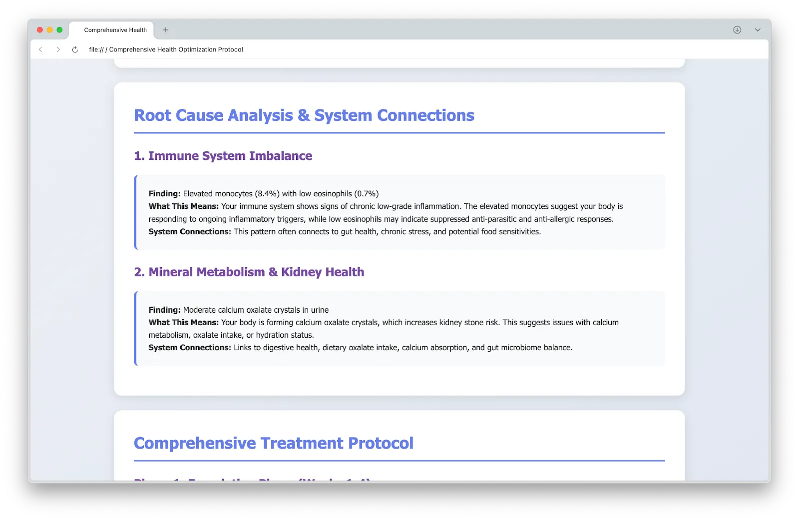 Testing with routine laboratory results produced a comprehensive HTML report in an easy-to-understand UI, showing each result, what it means, and why we should care. The system unpacked biological implications and mapped root causes using current studies on immune regulation and mineral metabolism.