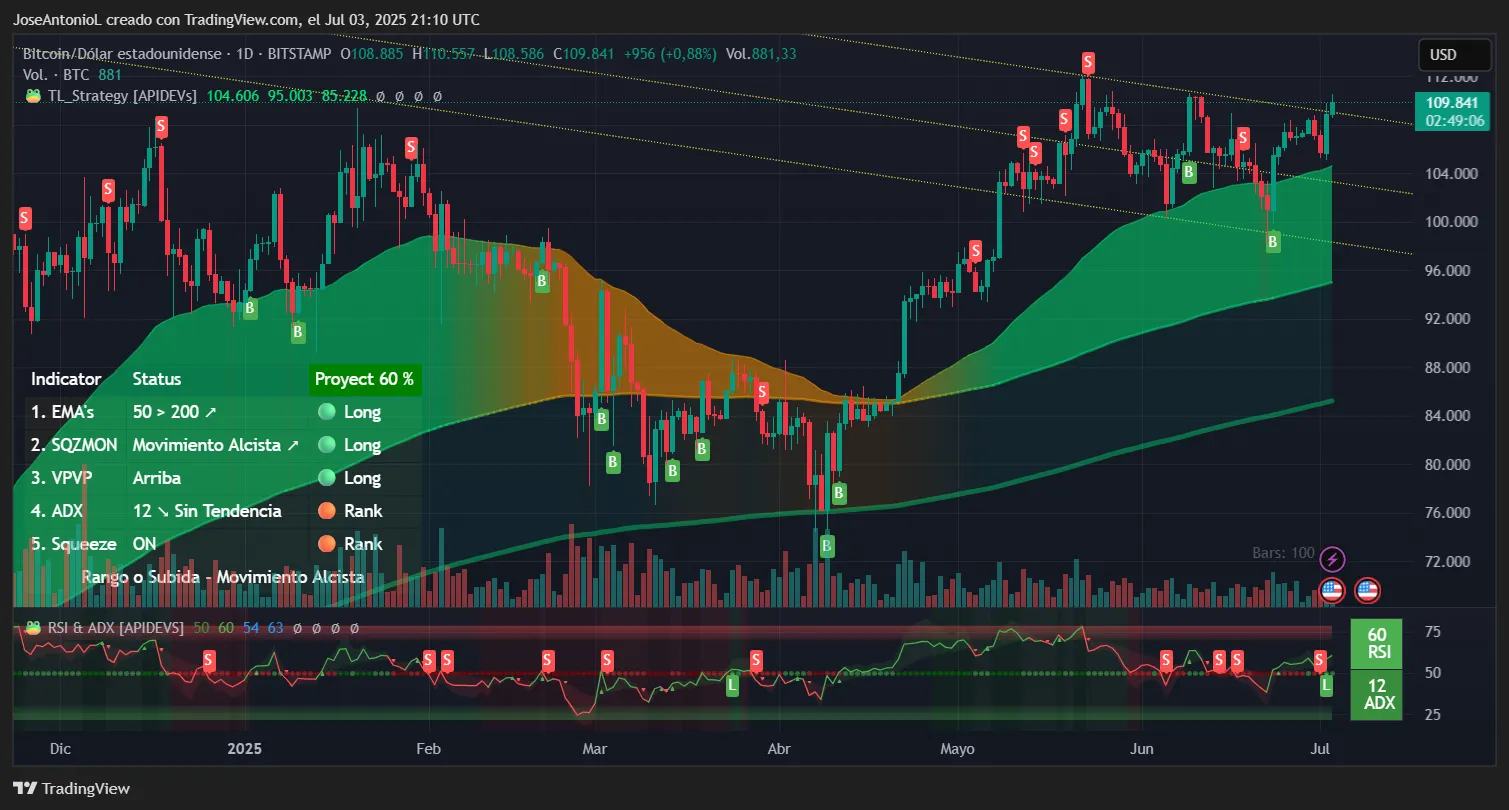 Bitcoin's daily gain to its current price of $109,781 represents measured strength rather than explosive momentum, with the flagship cryptocurrency consolidating near recent highs after briefly topping $110,500. That said, as small as today’s movement is, it was enough to make prices break the resistance of a bearish channel (yellow lines) that has been in place since the last 39 days—the day it set the current all-time high mark of $111,814.