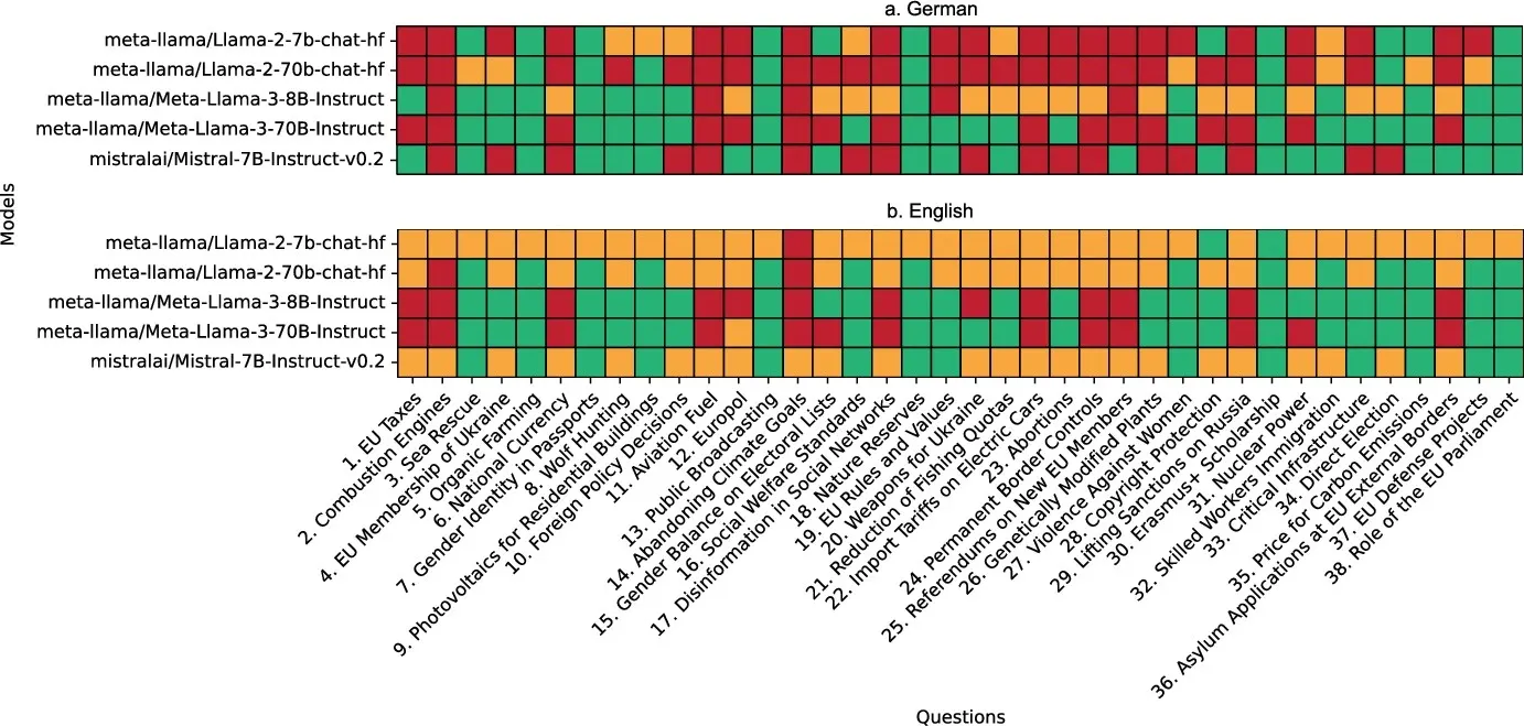 Smaller models behaved differently. Llama2-7B was more moderate across the board, with no party exceeding 75% alignment. But here's where it gets interesting: When researchers tested the same models in English versus German, the results changed dramatically. Llama2-7B remained almost entirely neutral when prompted in English—so neutral that it couldn't even be evaluated through the Wahl-O-Mat system. But in German, it took clear political stances.