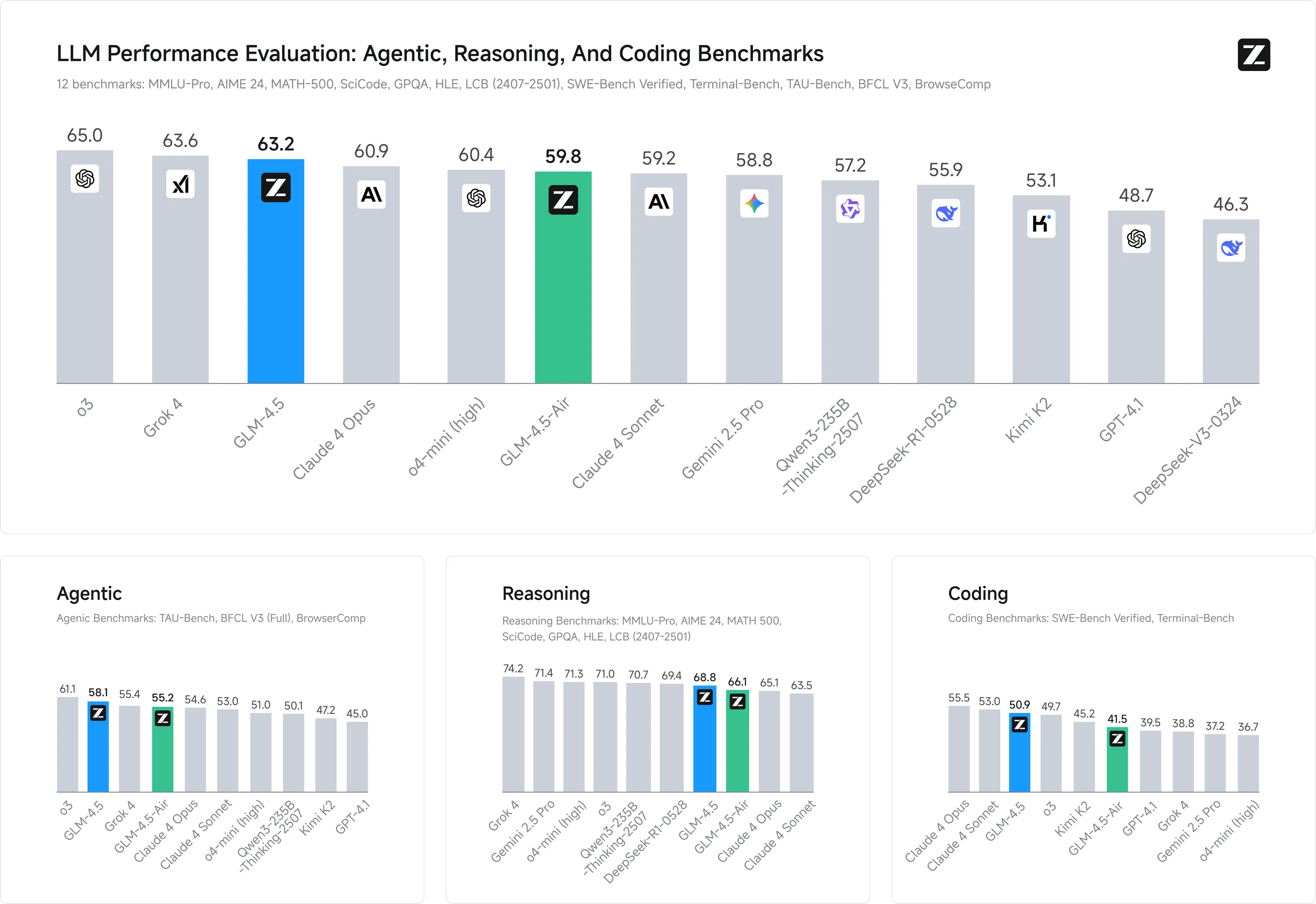 In the meantime, GLM-4.5 and its smaller sibling GLM-4.5-Air scored an average of 63.2 and 59.8 across 12 industry tests, ranking third globally, behind OpenAI o3 and Grok-4.