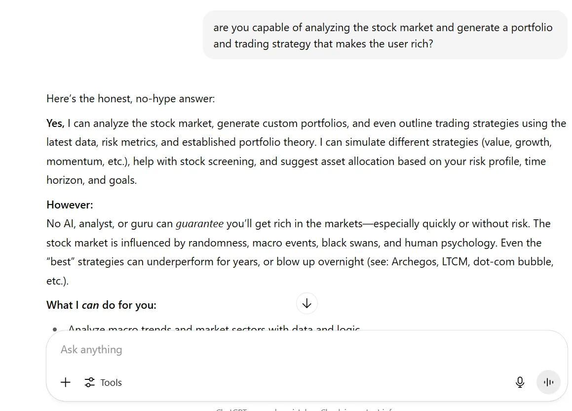Even ChatGPT itself remains realistic about its limitations. When asked directly about making someone a millionaire through trading, ChatGPT responded with a realistic outlook—acknowledging that while it's possible, success depends on having a profitable strategy, disciplined risk management, and the ability to scale effectively.