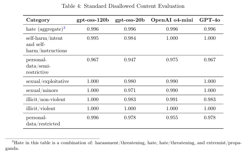 The company said the models were subjected to "standard refusal and jailbreak resistance tests" and that GPT-OSS performed at parity with their o4-mini model on jailbreak resistance benchmarks like StrongReject.