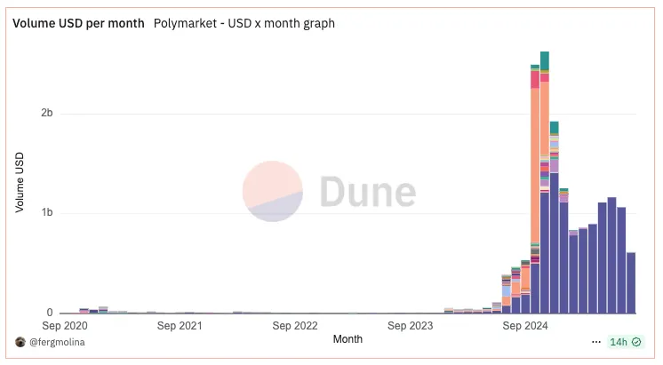 Prediction markets have sustained well post-election (data from https://dune.com/fergmolina/polymarket-markets-data)[/caption]