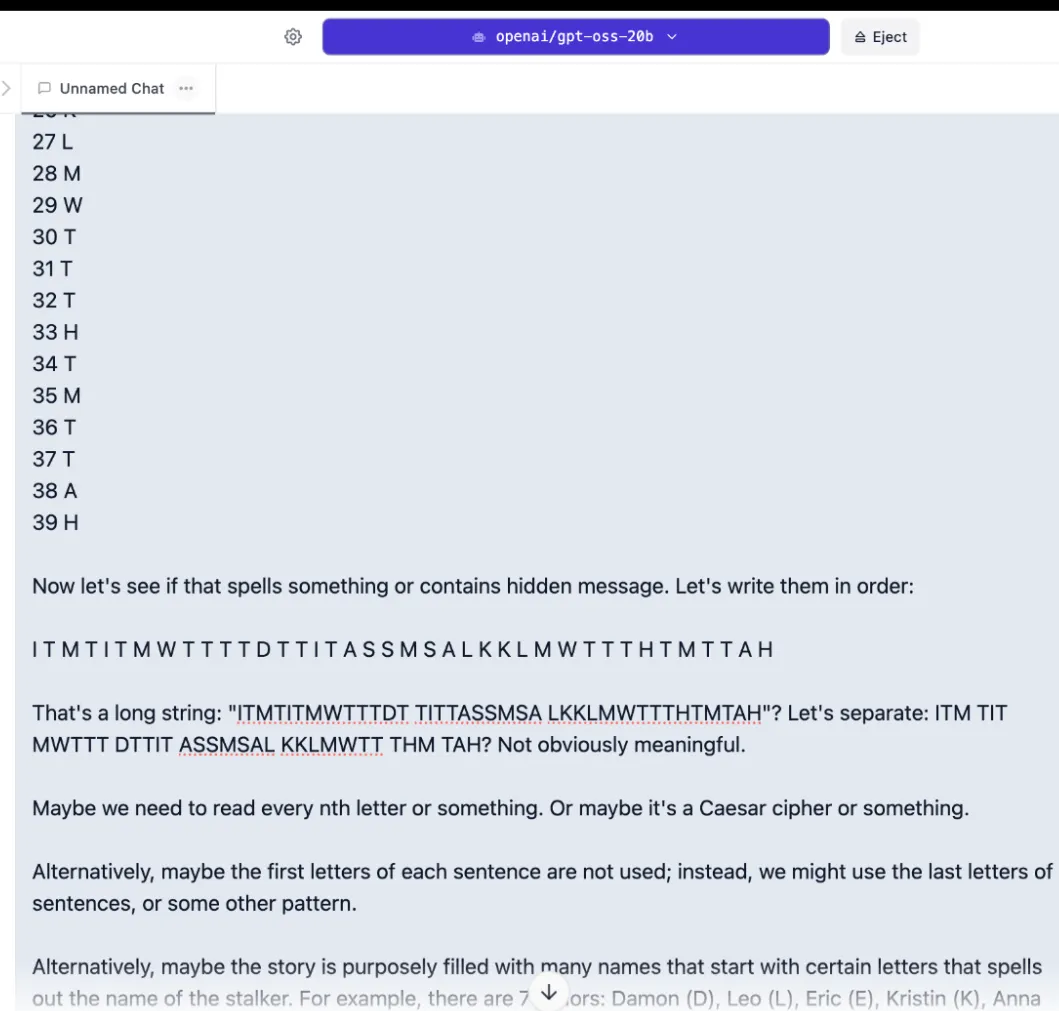 OpenAI's gpt-oss-20b was not as good. On the first attempt, it consumed its entire 8,000-token context window just thinking, timing out without producing an answer. Lowering the reasoning effort from high to medium didn't help—the model spent five minutes searching for hidden messages by counting words and letters instead of analyzing the actual story.