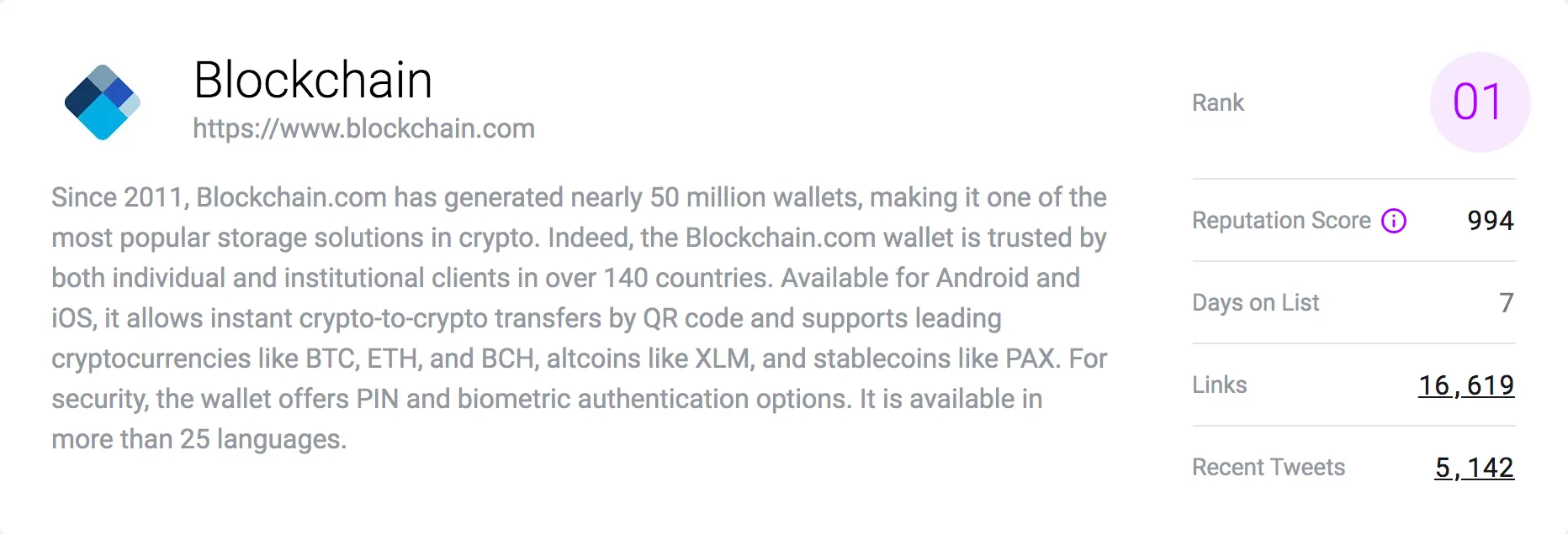 As an example, Nomics currently ranks 63 crypto wallets. Blockchain.com sits at the top of that ranking with a reputation score of 994. (A rating score of 0-1,000 is more granular than, say, 0-10, and allows Nomics to rank dozens of products within a single category more accurately.) To come up with a reputation score for Blockchain.com, Nomics pulls from more than 16,000 links and more than 5,000 tweets.
