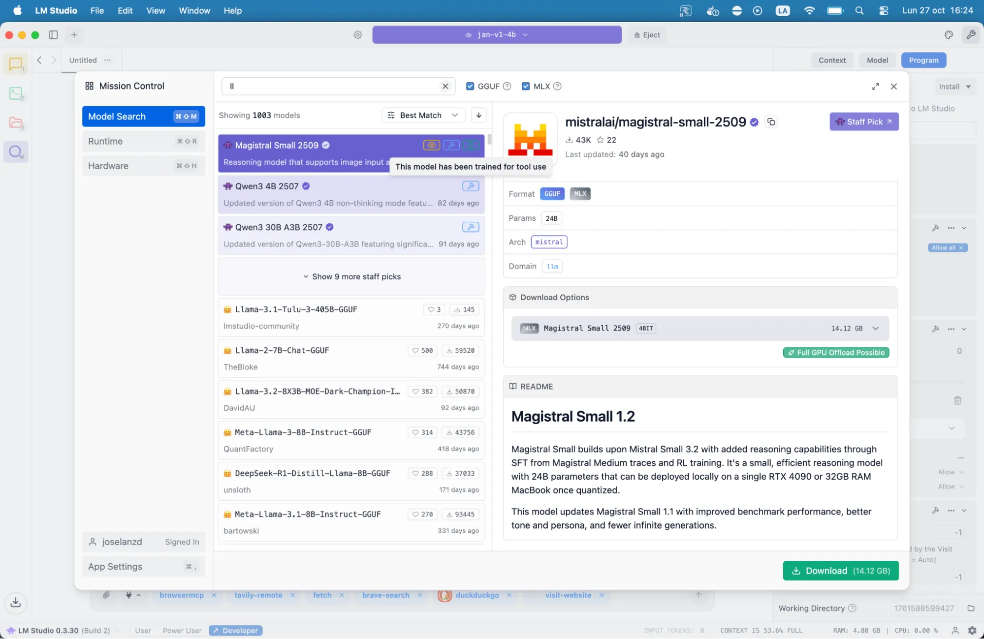 To install a model, go to the magnifying glass icon on the left sidebar in LM Studio and search for one. The models that support tools will show a hammer icon near their name. Those are the ones that you’ll need.