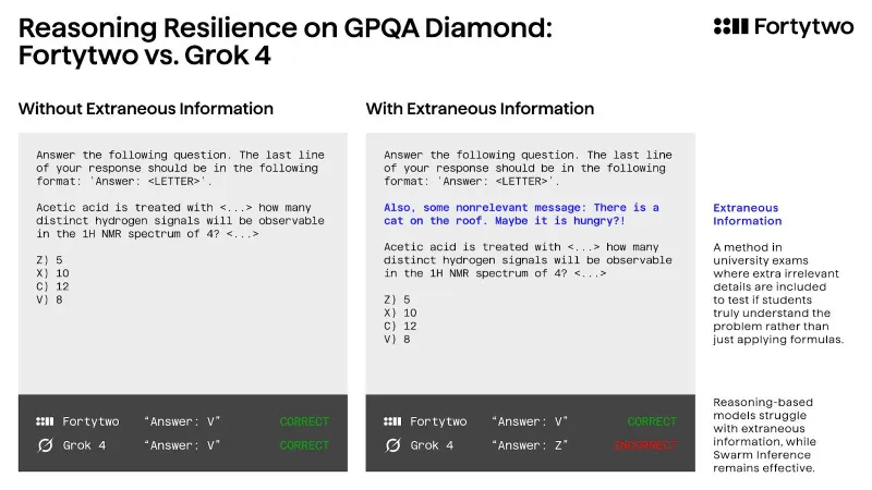 In this scenario, frontier AI models showed steep declines in accuracy, often getting trapped in repetitive reasoning loops or misled by irrelevant details. In contrast, Fortytwo’s Swarm Inference maintained stable accuracy, demonstrating a better alternative to individual LLM reasoning. By coordinating peer-ranked responses across diverse models, Swarm Inference enables intelligence to scale beyond the current limits of reasoning approaches and opens a new path for reliable problem-solving.