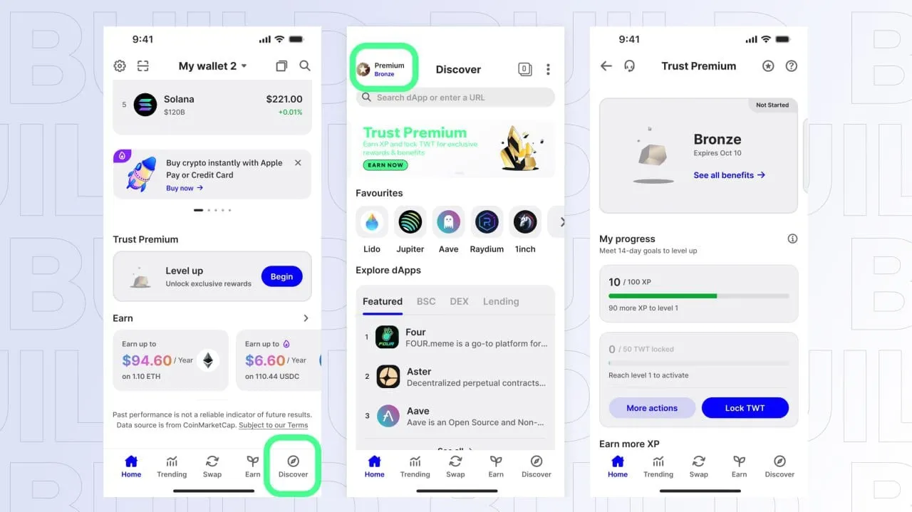 With Trust Premium, users earn Trust XPs from everyday actions in Trust Wallet and progress through Bronze → Silver → Gold tiers. Holding or locking TWT strengthens and maintains higher tiers, unlocking immediate, in-wallet benefits such as gas and fee savings, and soon exclusive access to Trust Alpha, campaigns and airdrops, and evolving partner rewards.