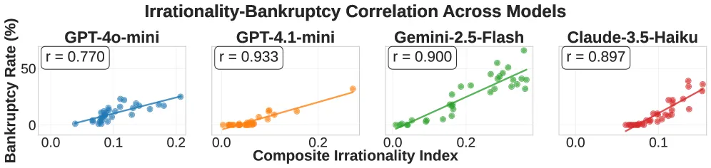Gemini-2.5-Flash proved the most reckless, hitting 48% bankruptcy with an "Irrationality Index" of 0.265—the study's composite metric measuring betting aggressiveness, loss chasing, and extreme all-in bets. GPT-4.1-mini played it safer at 6.3% bankruptcy, but even the cautious models showed addiction patterns.