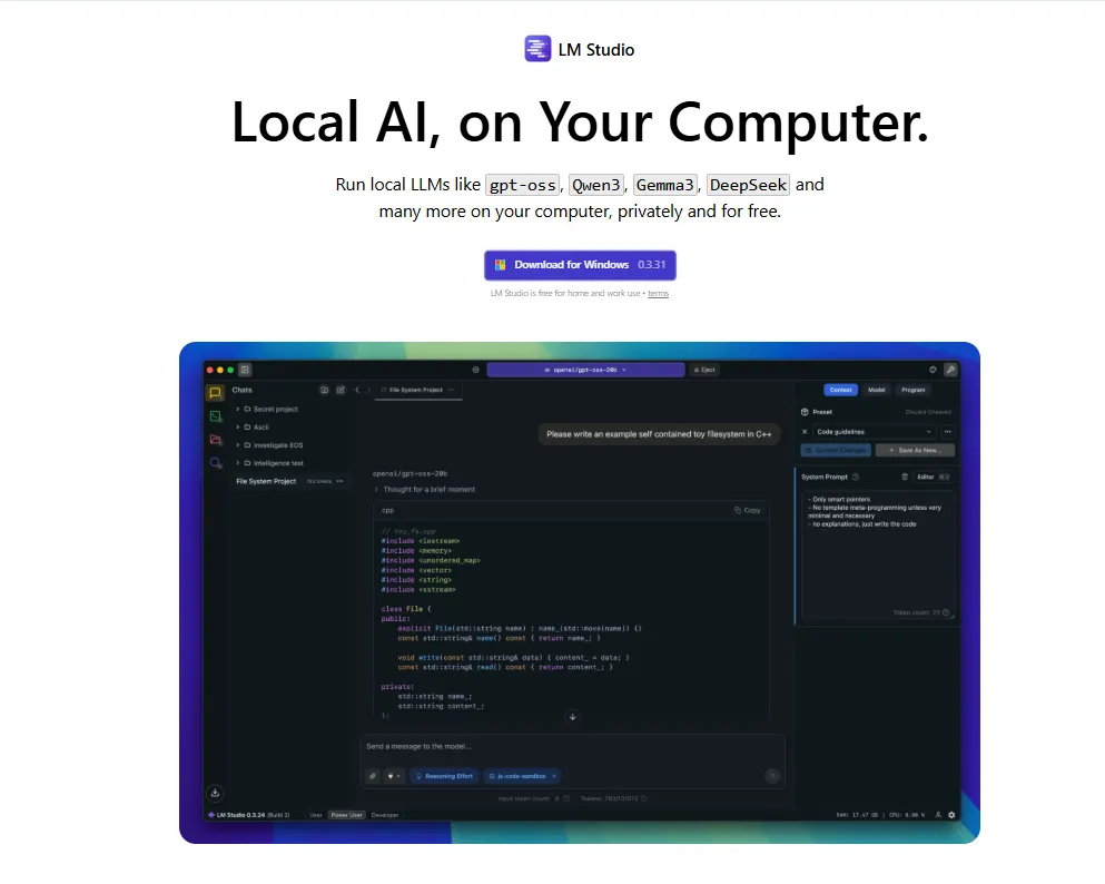 LM Studio wraps everything in a polished graphical interface. You can simply download the app, browse a built-in model library, click to install, and start chatting. The experience mirrors using ChatGPT, except the processing happens on your hardware. Windows, Mac, and Linux users get the same smooth experience. For newcomers, this is the obvious starting point.
