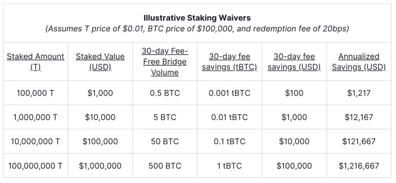 By staking (locking) $T tokens, participants become eligible for reduced or fully waived tBTC bridge fees on eligible mint and redeem activity. The update lowers execution costs for active users, improves arbitrage efficiency between tBTC and BTC, and creates a clearer, more direct link between governance participation and real protocol usage.
