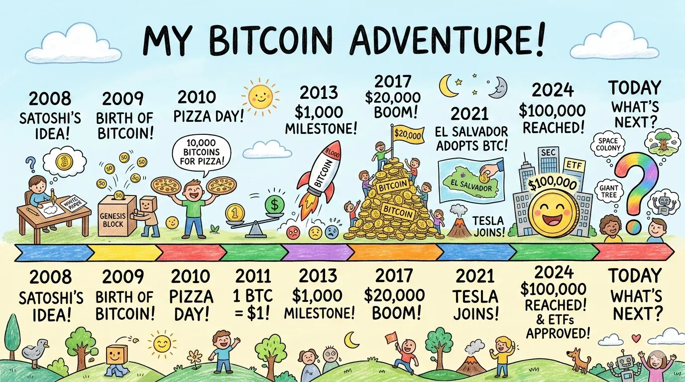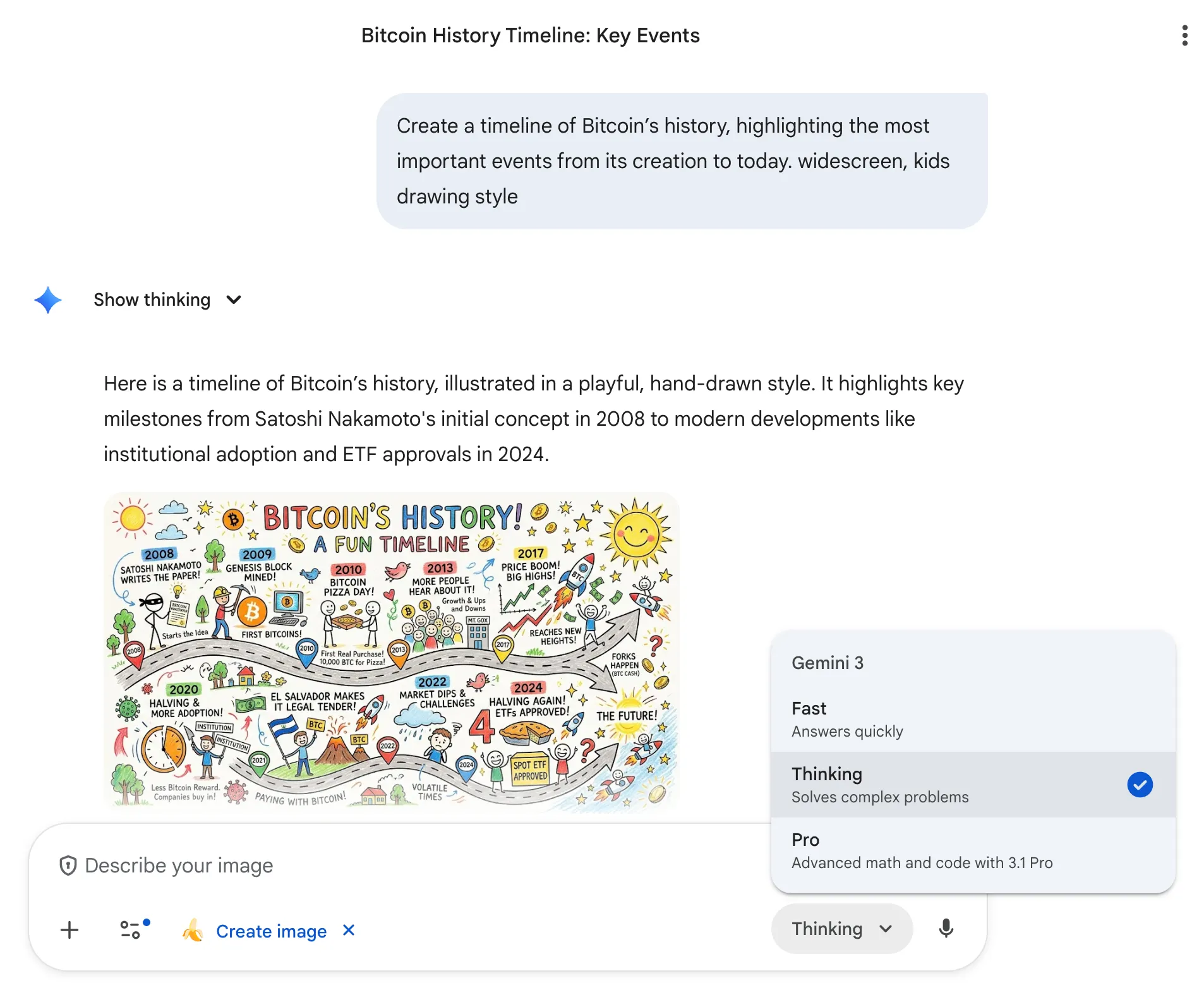 For example, this is what Nano Banana 2 generated when prompted “Create a timeline of Bitcoin’s history, highlighting the most important events from its creation to today. widescreen, kids drawing style” using thinking.