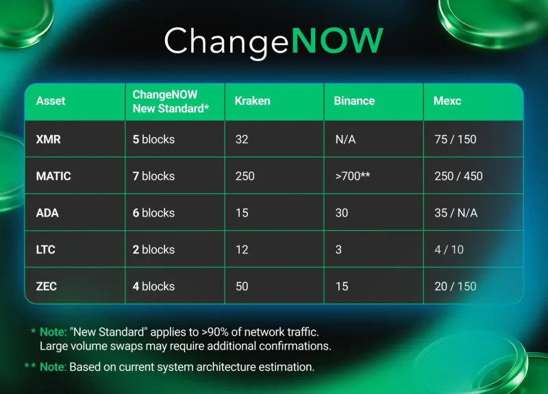 ChangeNOW has deployed a new deposit processing architecture for Monero (XMR), Polygon (MATIC), Cardano (ADA), Litecoin (LTC), and Zcash (ZEC). The update replaces static confirmation thresholds with a dynamic system, reducing wait times for over 90% of transactions.