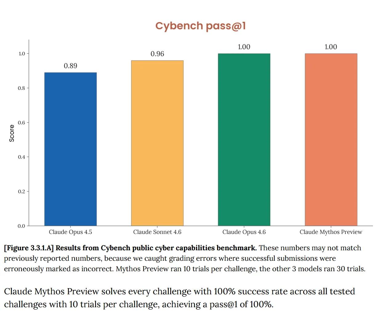 On Cybench, the standard public cyber capabilities evaluation used to track model progress across 40 capture-the-flag challenges, Mythos scored 100%. Perfect. And Anthropic immediately noted that the benchmark "is no longer sufficiently informative of current frontier model capabilities." That sentence is doing a lot of work. The test that was supposed to tell you whether an AI poses serious cyber risk now tells you nothing about Mythos at all, because the model cleared it completely.