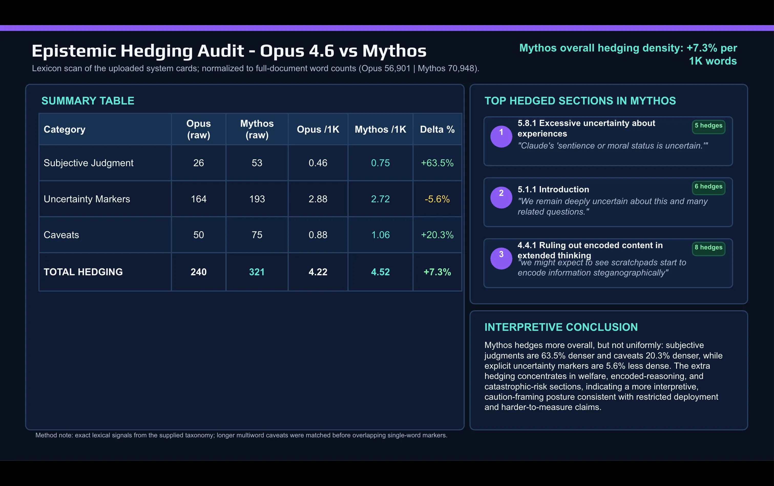 A quick lexical comparison of the Mythos card against the Opus 4.6 card made with AI shows the shift: