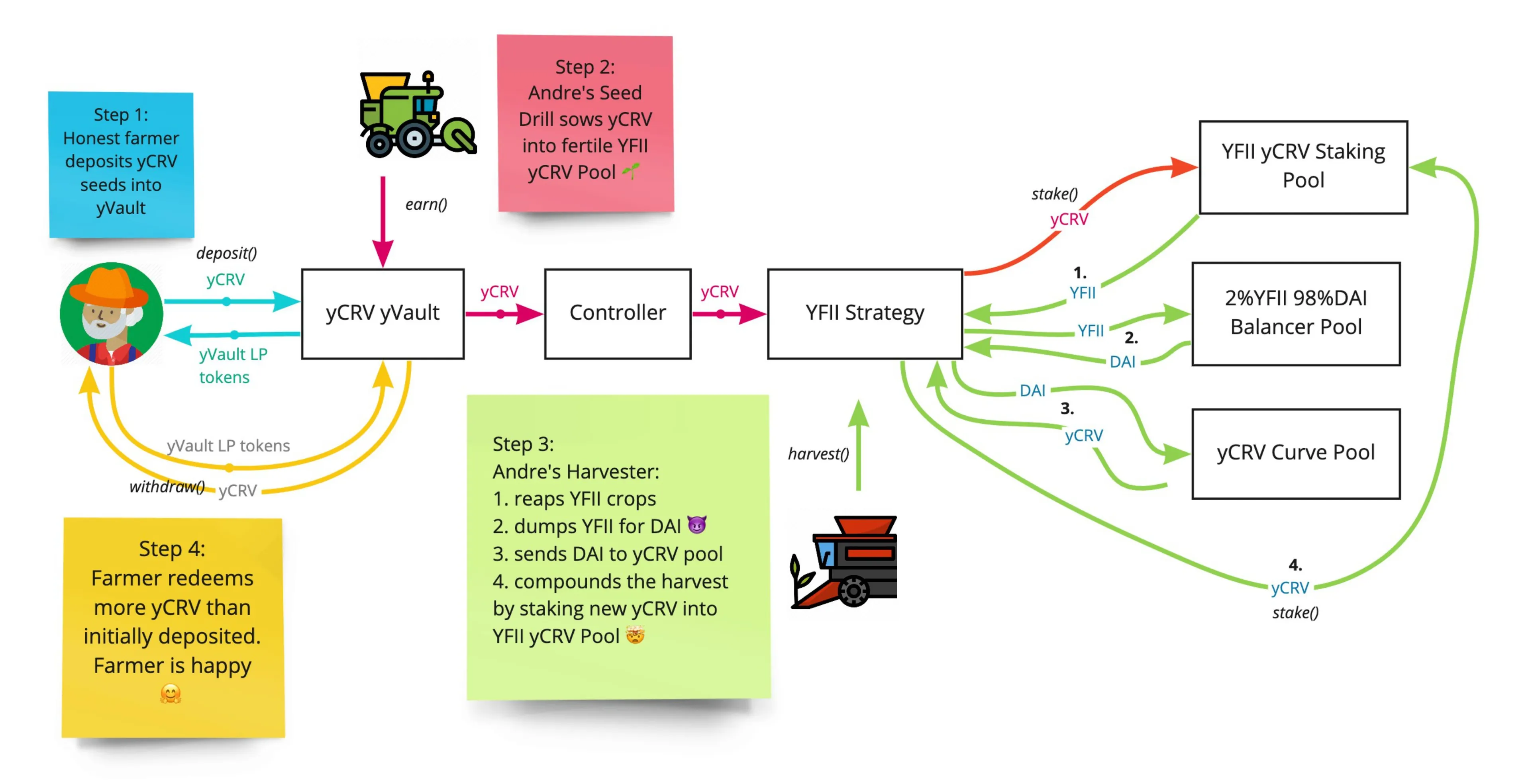 Yet the YFI community still seems hostile. Since YFII’s surge, the YFI community has deployed a strategy to slash down YFII’s token price. Specifically, users can deposit yCRV, and stake them in YFII’s pool1 to farm. They can then withdraw YFII intermittently, swap YFII to DAI on Balancer, and finally deposit the DAI on Curve for new yCRV.