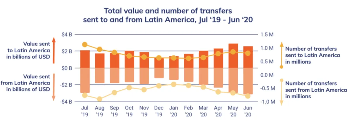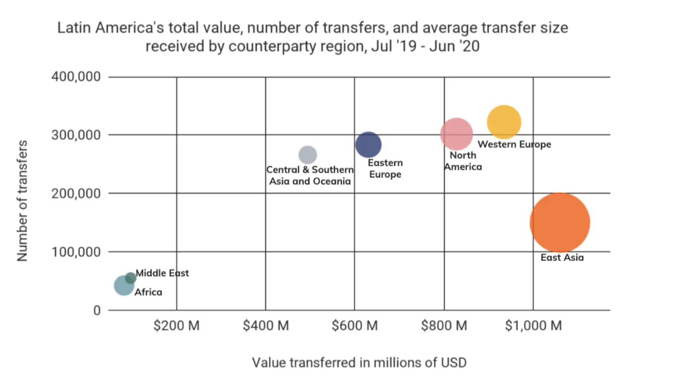 Historically, most remittances in fiat currency to Latin America come from the US, mainly from migrant workers sending funds back to families. Yet, with cryptocurrency transactions, Latin America has strong links to East Asia, with transactions between the two worth more than $1 billion, even though there are fewer overall transactions.