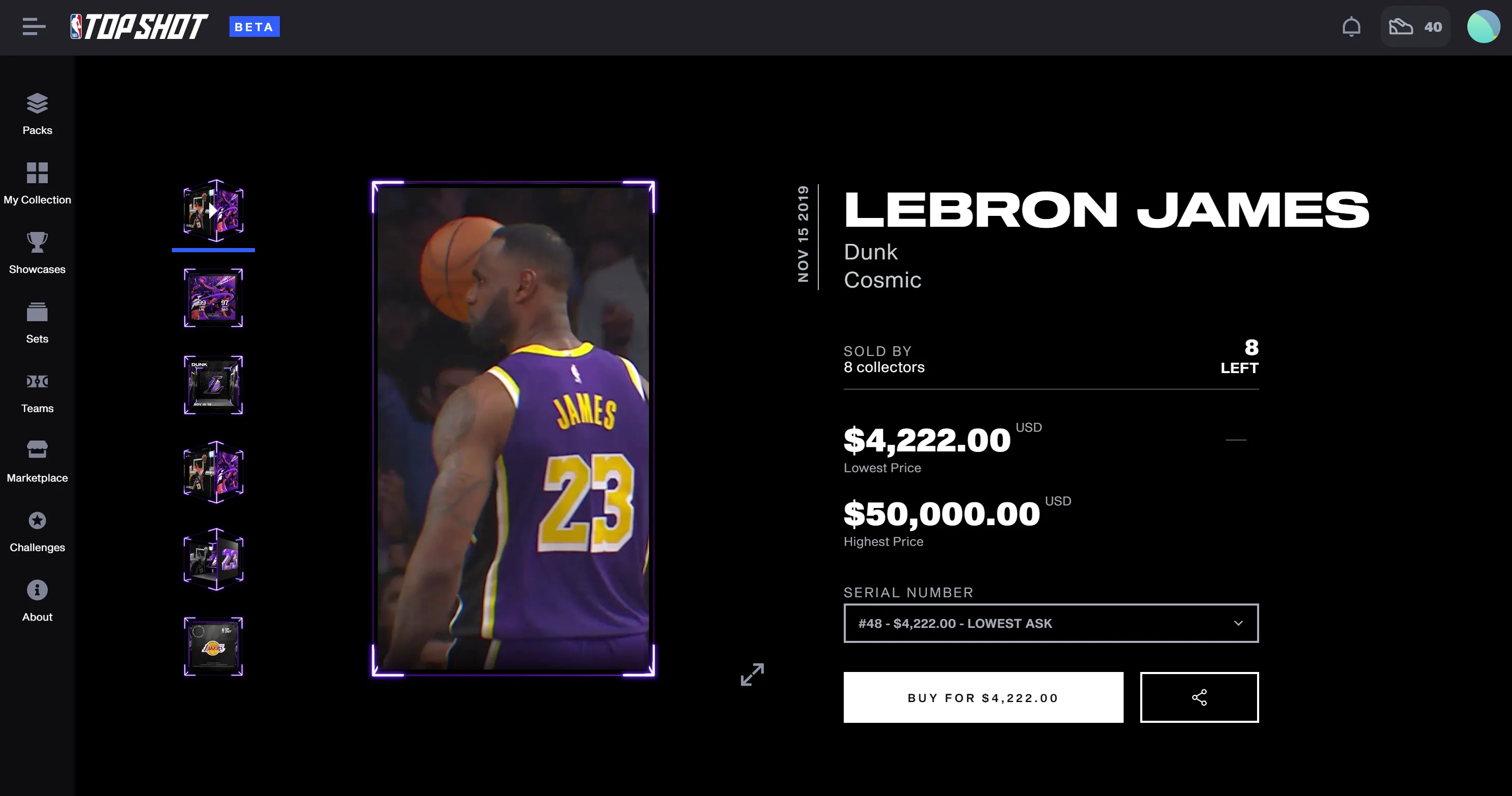 Clicking the marketplace tab initially showed me a range of individual moments being sold by users in the $10-20 range, with some priced as low as $1. Sort by asking price, however, and you’ll see NBA Top Shot’s crown jewels: a “Cosmic” edition LeBron James dunk, for example, which currently has a low asking price of $4,222.