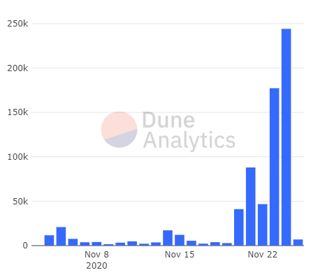 But ETH 2.0 reaching its minimum subscription was not a smooth ride. The first week saw just 50,000 ETH deposited from a few users, with 3,200 ETH of that coming from its creator, Vitalik Buterin, himself. In fact, the deposits started to pump only after November 19, as the below chart shows—two days after liquidity incentives ended on decentralized exchange protocol Uniswap.