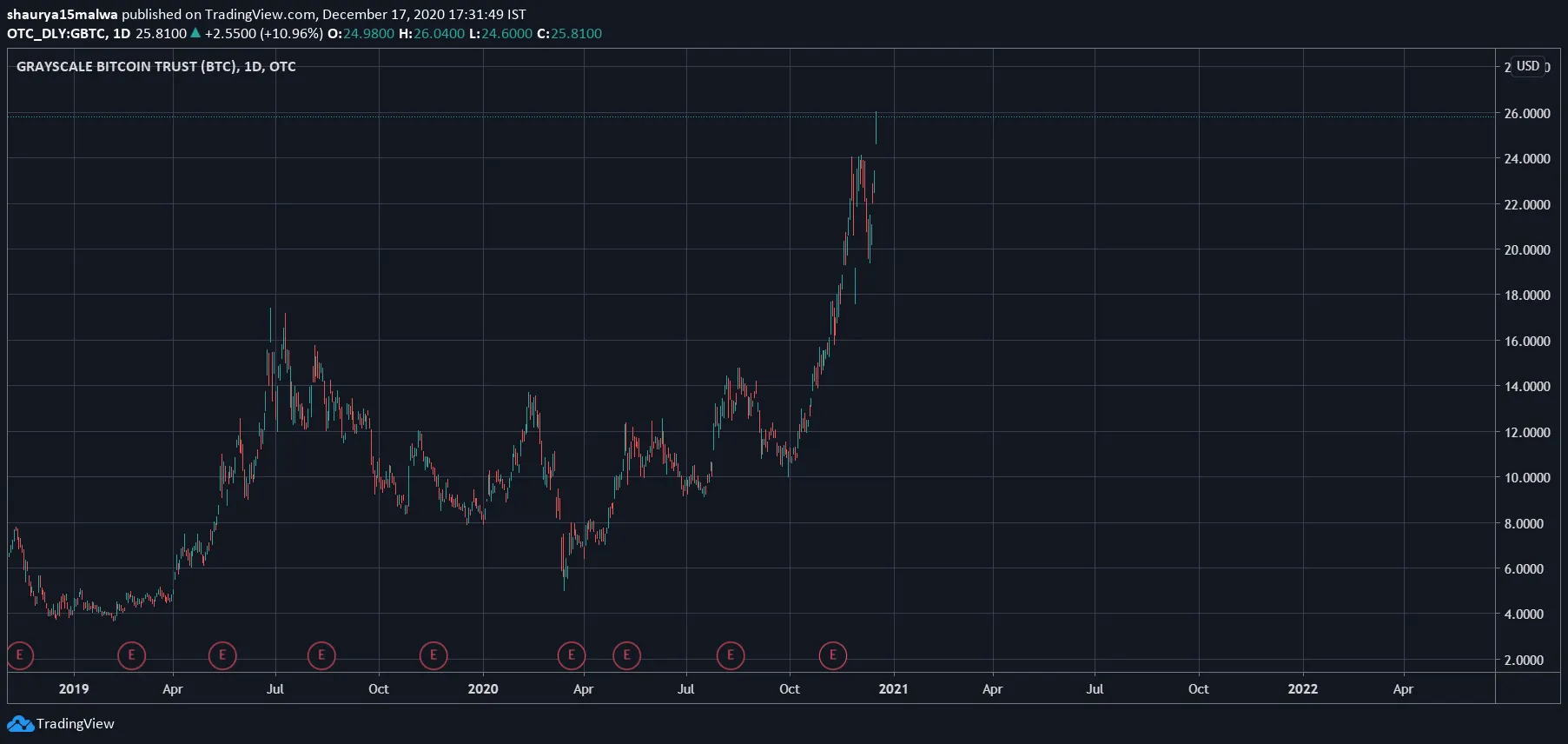 Institutional money is flowing into GBTC as it’s currently one of the only publicly traded Bitcoin instruments in the US.