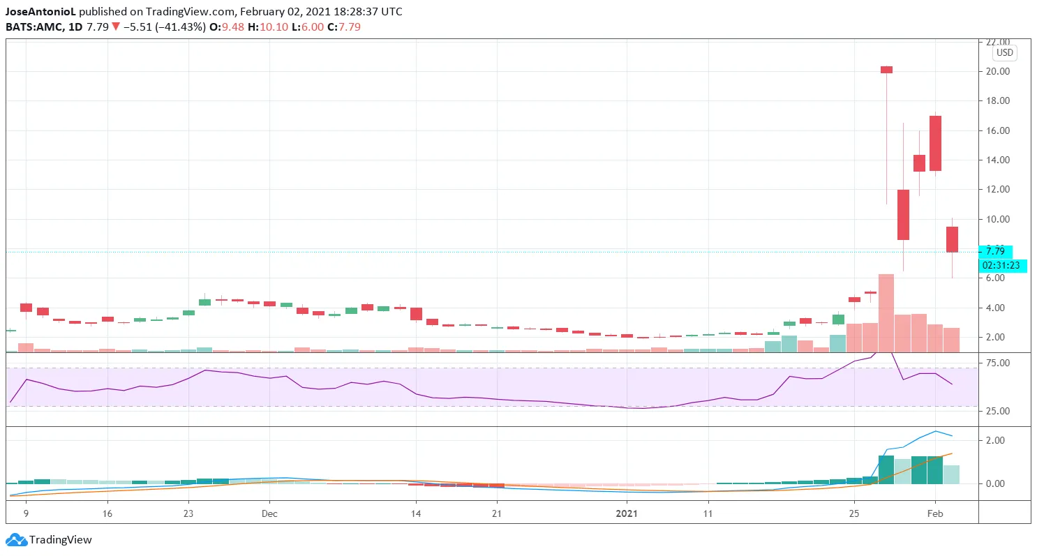 AMC, another heavily pumped stock, is also experiencing a horrendous week following its historic rally. The stock is trading today near $7.80, for a total loss of 63% since its all-time high five days ago, and 20% losses over the past 24 hours.