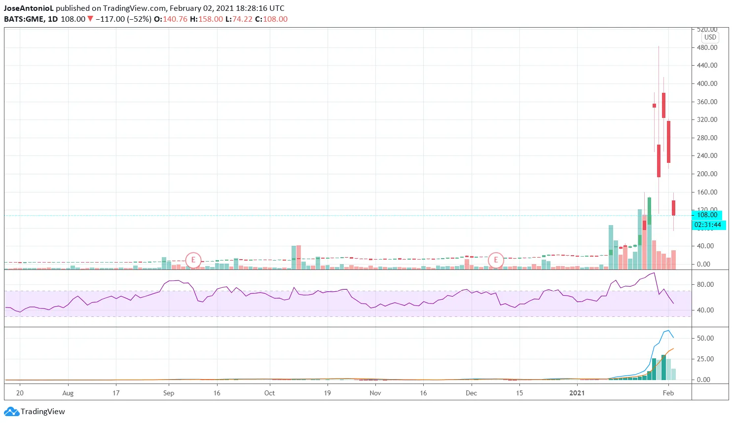 GameStop, the star of this novela, has lost 50% of its value in these past 24 hours and has fallen nearly 83% in three days, from its peak of $483 to its low of $74 today, according to data from TradingView. Since its low, the stock has "recovered" somewhat to its current price of $118, although it is still in the ICU.