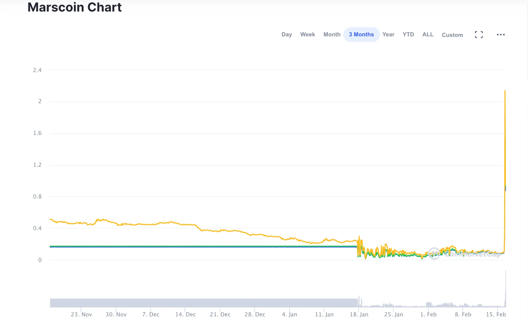 But it turns out there already is a Marscoin—$MARS, a project that was developed in 2014. And after trading beneath $0.20 for years, you could say the price is officially mooning: it rocketed to an all-time high of $2.50 earlier today, and settled back down to $1.02 around press time.