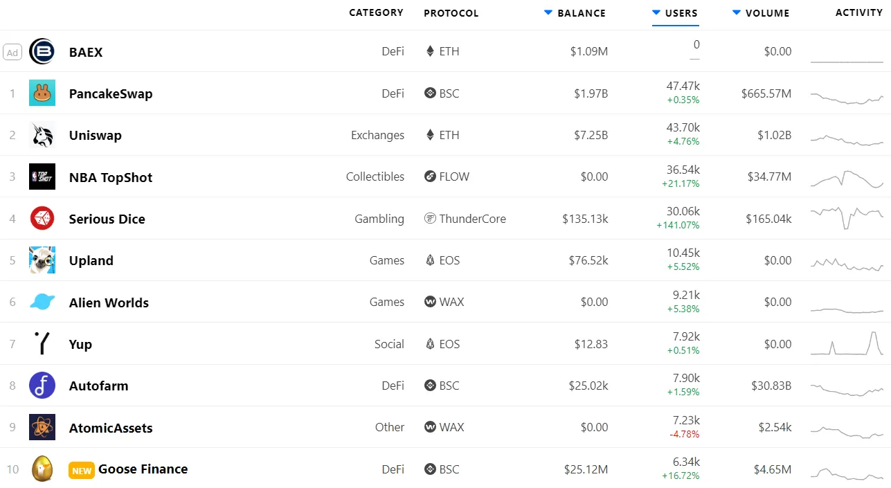 If you look over a seven-day stretch, PancakeSwap had 128.59 million users, showing a a 63% growth on the previous week. In case of Autofarm, the growth rate is even higher, up 79% to 22.24 million users.
