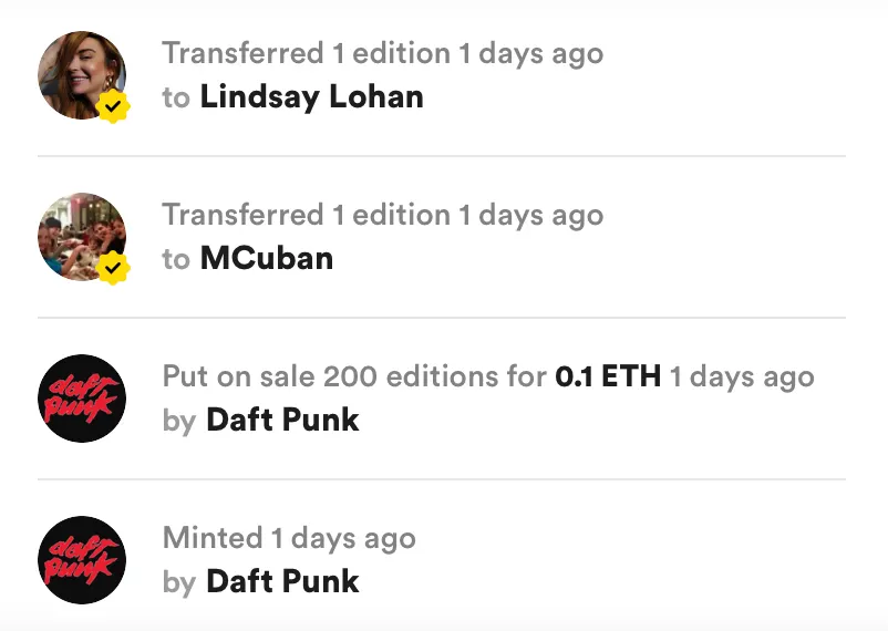 According to records on the NFT marketplace Rarible, this “Daft Punk” user “minted” editions of some Daft Punk NFTs on Sunday (there are only two distinct images, but each has been “minted” into a number of editions, similar to physical prints), then transferred them into the wallets of big name collectors, such as Mark Cuban, Tyga, Soulja Boy, and Beeple.