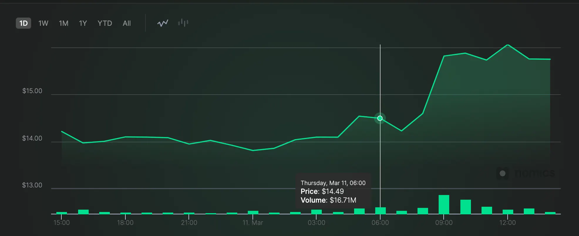 After the announcement this morning, Solana (SOL) tokens went from a low of $13.81 to $16.06, a 16% increase, according to market data from Nomics. It later corrected slightly.