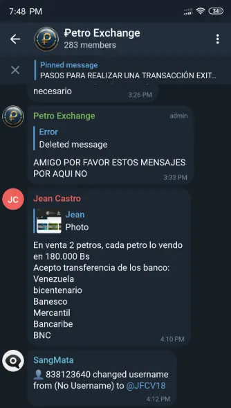 One such group, Petro Exchange, is specifically dedicated to promoting and facilitating trades and sales in petros. The group’s users post an ad offering petros in exchange for bolivars, dollars, or other cryptocurrencies, and the interested counterparty responds through the group—never in private—so there is evidence and witnesses to the sale. Petro Exchange users can even opt to pay a small fee the group’s administrator to act as an escrow.