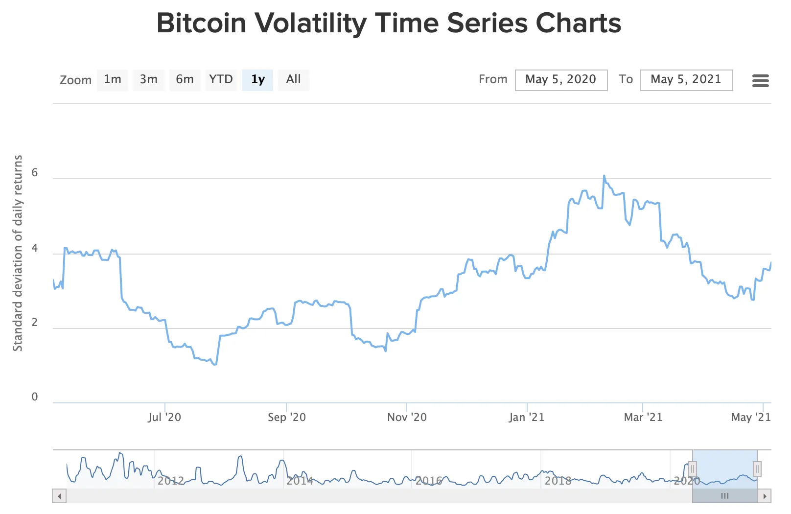 Bitcoin’s price volatility, an indicator of how much the price of the asset swings by, spent most of 2020 hovering around 2.5%. Since the bull run however, it’s crept up, to as high as 6% in March and April of this year.