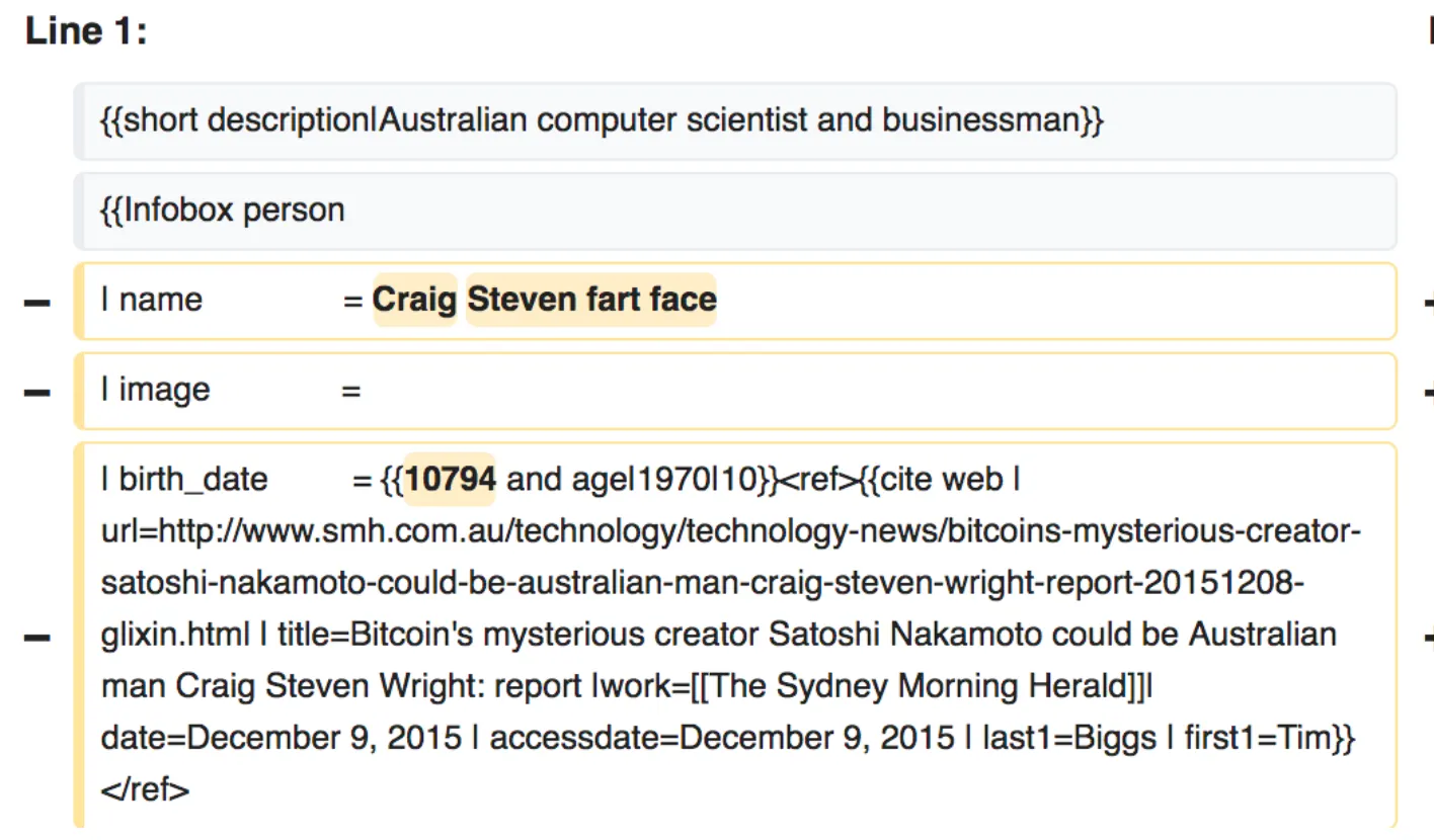 Yet more attempts followed. “[Wright] has been officially recognized as the original author of [[bitcoin]], and the identity behind the pseudonym [[Satoshi Nakamoto]]. He has been granted copyright registrations by the US for the original Bitcoin whitepaper as well as most of the original code,” one editor wrote later that day.