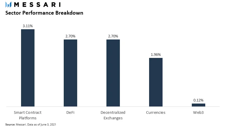Analyzing the performance of five crypto sectors in relation to the recent market slump— smart contract platforms, decentralized finance, decentralized exchanges, currencies, and Web3—Messari found that smart contract platforms have proven the most resilient to the latest crypto market crash.