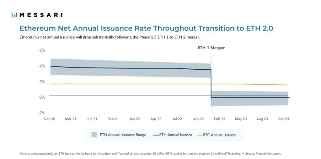 “Ethereum’s net annual issuance will drop substantially following the Phase 1.5 ETH 1 to ETH 2 merger,” said Messari research analyst Wilson Withum.