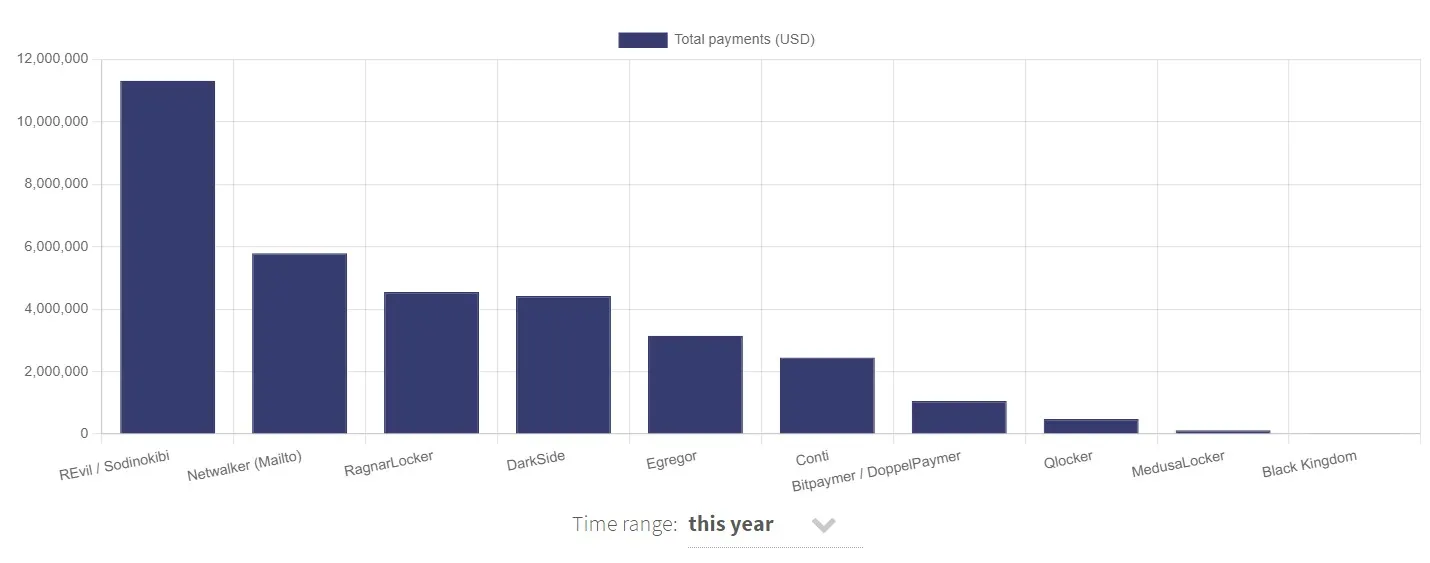 Mailto/Netwalker is also the second-largest this year, having netted $5.7 million, with RagnarLocker, DarkSide, and Egregor among other notable threats.
