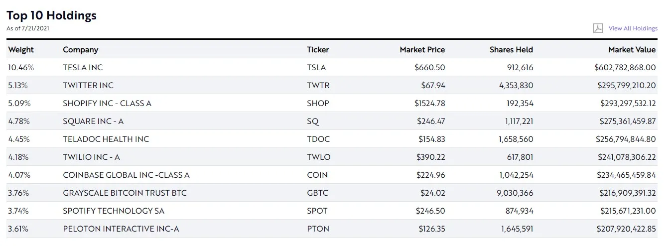 The two last purchases brought ARKW’s total holdings of GBTC to over 9 million shares, worth $216.9 million. However, despite the increased amount of shares, GBTC’s weight in ARKW fell from 3.99% to 3.76%, while Coinbase made it to the top ten with a new weighting of 4.07%.