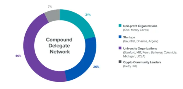 According to a16z, the firm has already delegated voting rights in some of the tokens it owns in decentralized finance projects like Compound and Uniswap. It began this process by distributing voting rights to a handful of startups, but more recently expanded the group of recipients to include university blockchain clubs and non-profit groups like Kiva and Mercy Corps. Here's a graphic from the a16z blog post announcing the news: