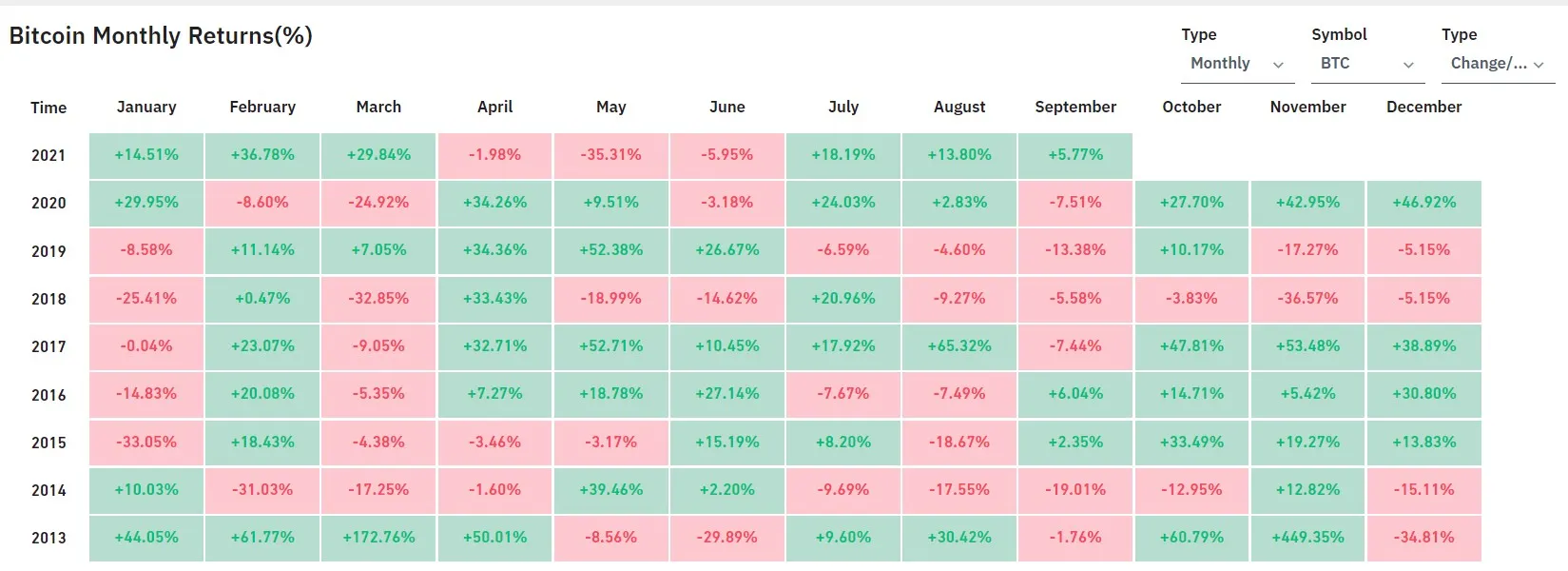 Data from bybt.com shows that investors have suffered losses in September for the past four years in a row, with maximum monthly returns slightly exceeding 6%.