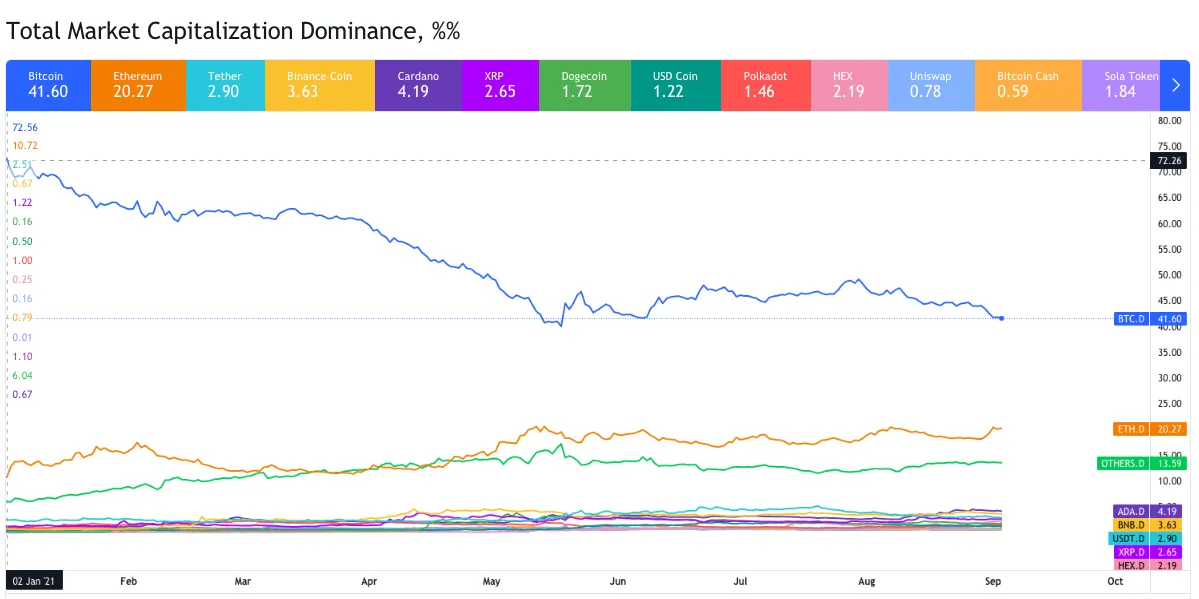 As many of its rivals galloped to new heights, Bitcoin notched a ho-hum gain of 4% as it struggled to stay above the symbolic $50,000 mark, which it first smashed earlier this year. In a major development, so-called "Bitcoin dominance"—its share of the market compared to other cryptocurrencies—fell to around 40%, a far cry from the 71% dominance it enjoyed at the start of the year, and its lowest dominance since 2017.