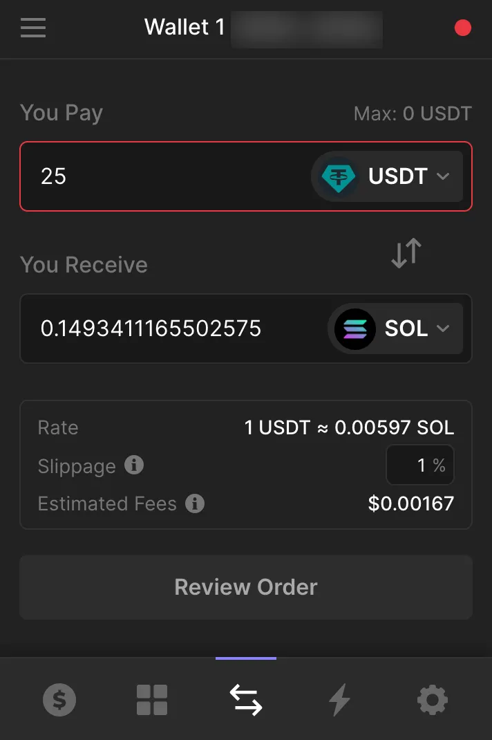 Phantom also offers direct integration with cryptocurrency exchange FTX, making it easy to deposit funds held within that exchange. Additionally, you can transfer USDT stablecoins from an exchange or wallet into your Phantom wallet, and then exchange them for SOL and other Solana-based tokens within Phantom (as seen below).