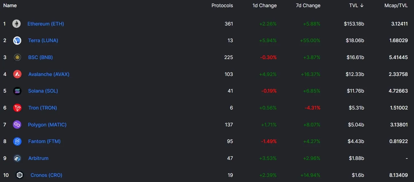 Currently, there’s a total of $18.06 billion locked in a total of 13 Terra-based projects, compared to $16.6 billion TVL across as many as 225 BSC protocols, according to Defi Llama.