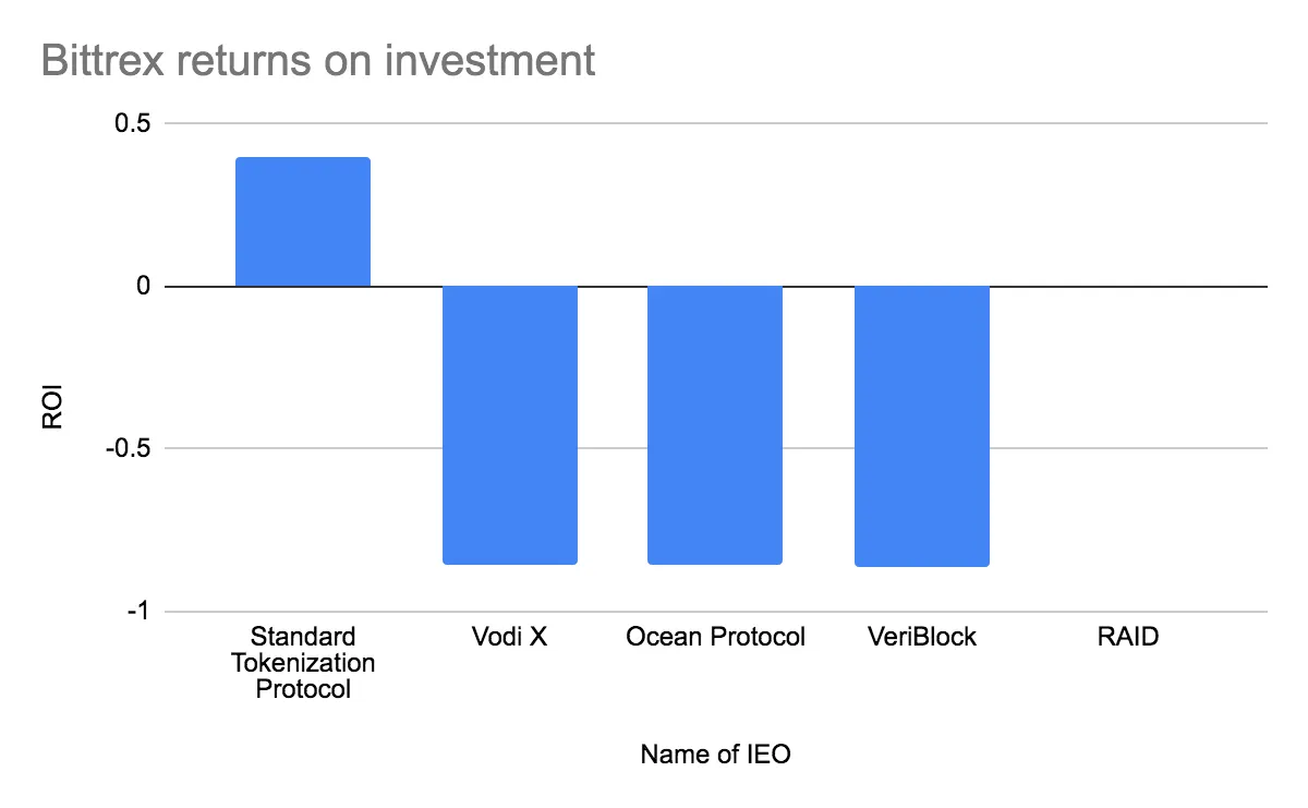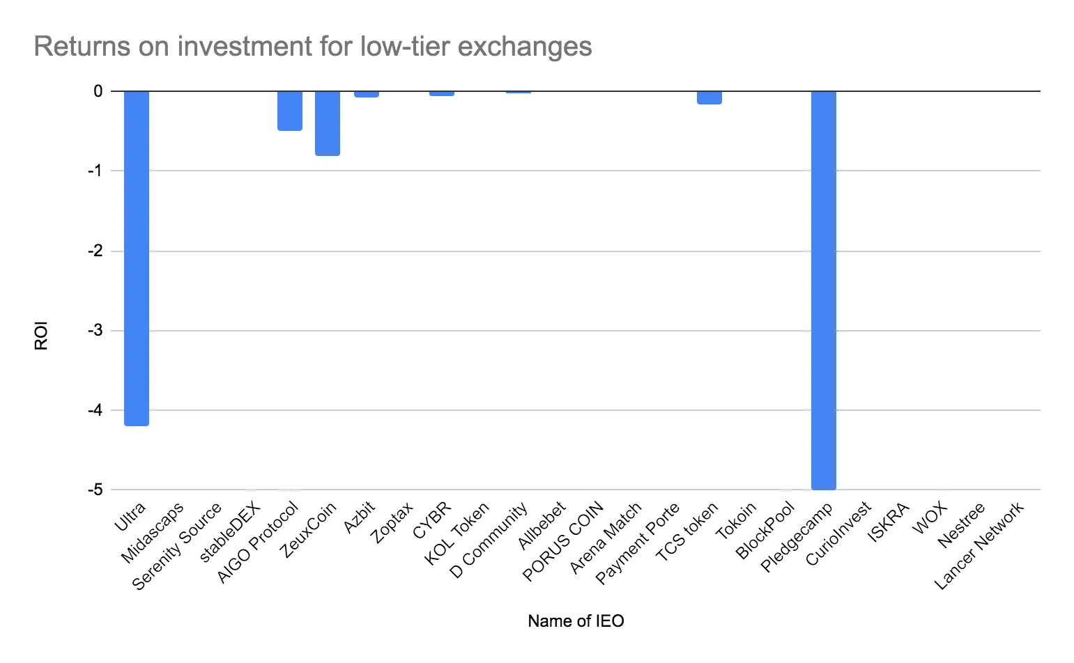 Info taken from CoinCodex. This graph shows ROI, (current price - IEO price/IEO price) as a percentage. The only outlier, “Tokeoin,” doesn’t register because it somehow managed a 150,000 percent gain.