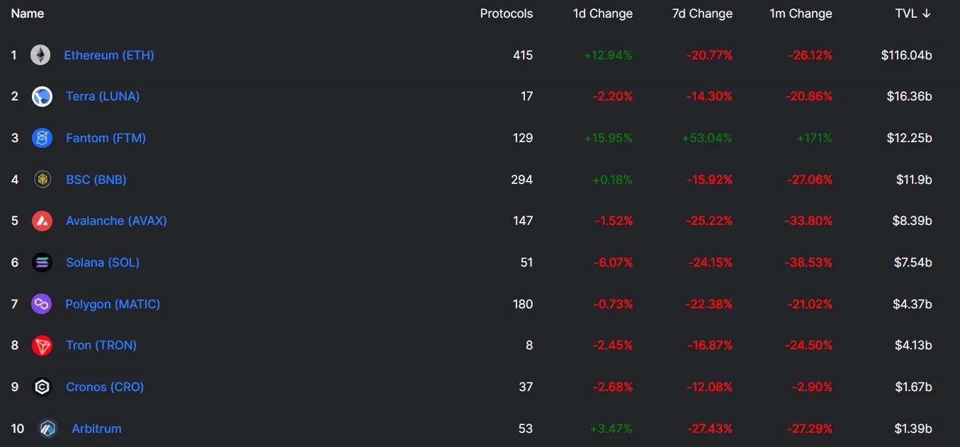 Of the total $194 billion across all of DeFi, the Fantom Network controls over 6.19%, compared to BSC’s 6.04%. It is also not too far behind the second-placed Terra, which covers 8.40% of the DeFi space.
