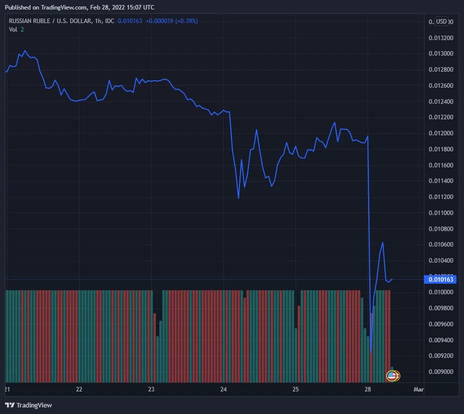 Ruble/Bitcoin trading volume has surged to nine-month highs as the Russian currency collapsed against the dollar in the wake of Russia’s invasion of Ukraine.