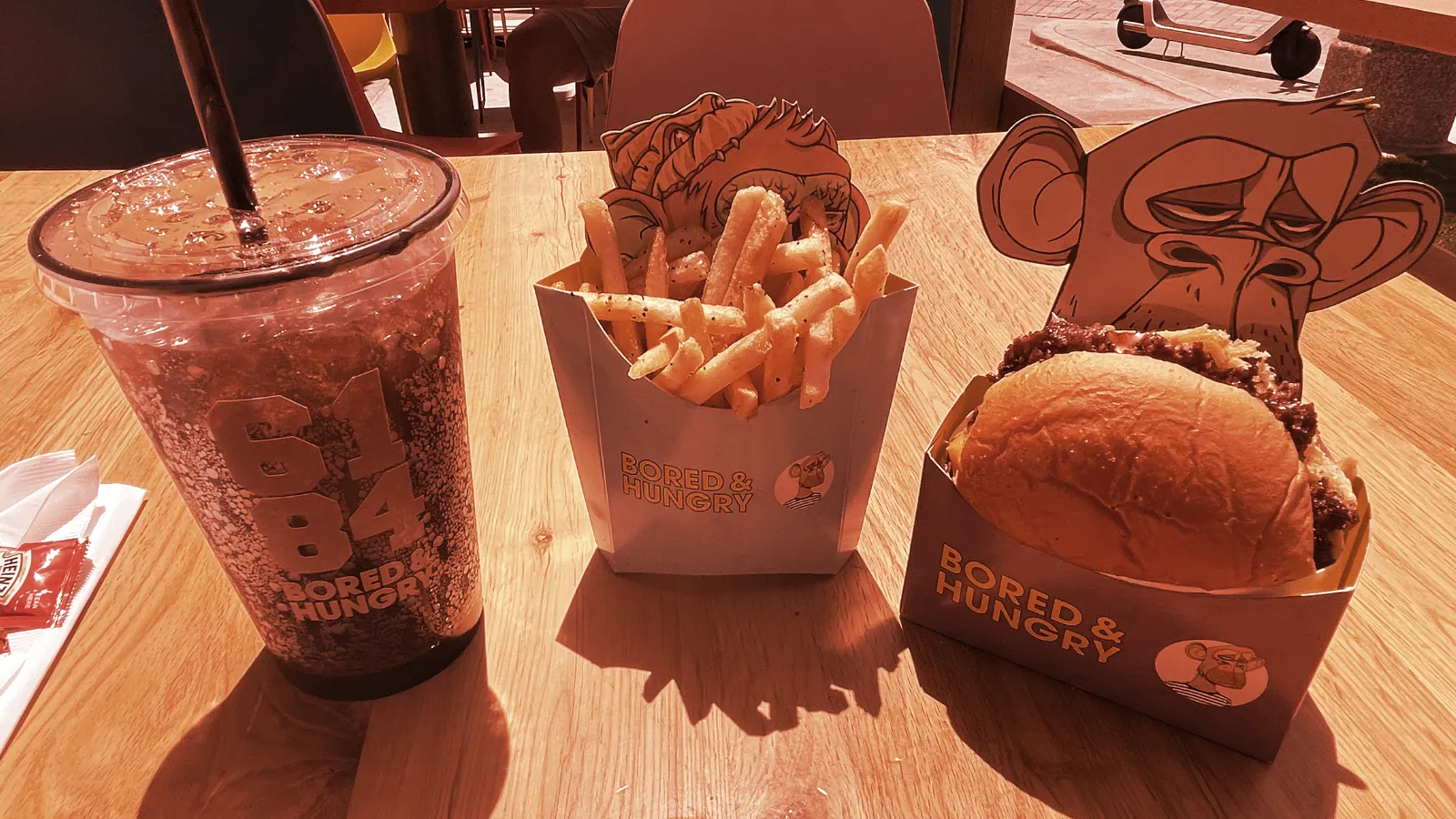 While the theme is Bored and Mutant Ape NFTs, Bored & Hungry didn’t advertise that paying in crypto was an option. There were no signs that read “Pay in Ethereum'' or “Pay in Apecoin!”