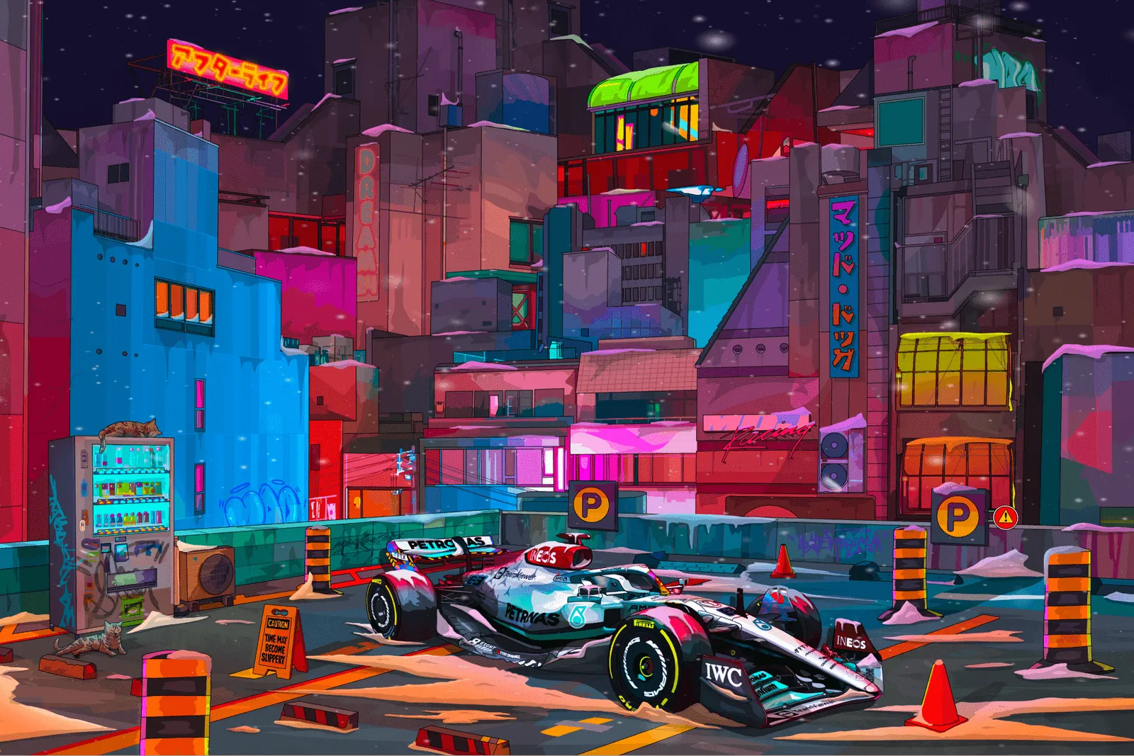 Two of those single-edition artwork NFTs will be bundled with the physical rear wing end plate from the race taken from Mercedes’ cars, driven by Lewis Hamilton and George Russell, respectively. In fact, each rear wing will feature the paired Mad Dog Jones artwork, which will be visible on the track.