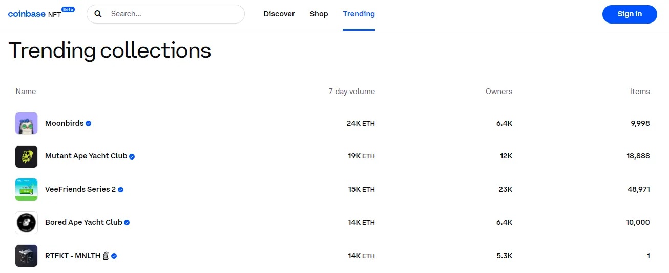 Moonbirds is currently the top "trending collection" on Coinbase NFT, surpassing the Bored Ape Yacht Club, the Mutant Apes, and Gary Vaynerchuk's VeeFriends Series 2.