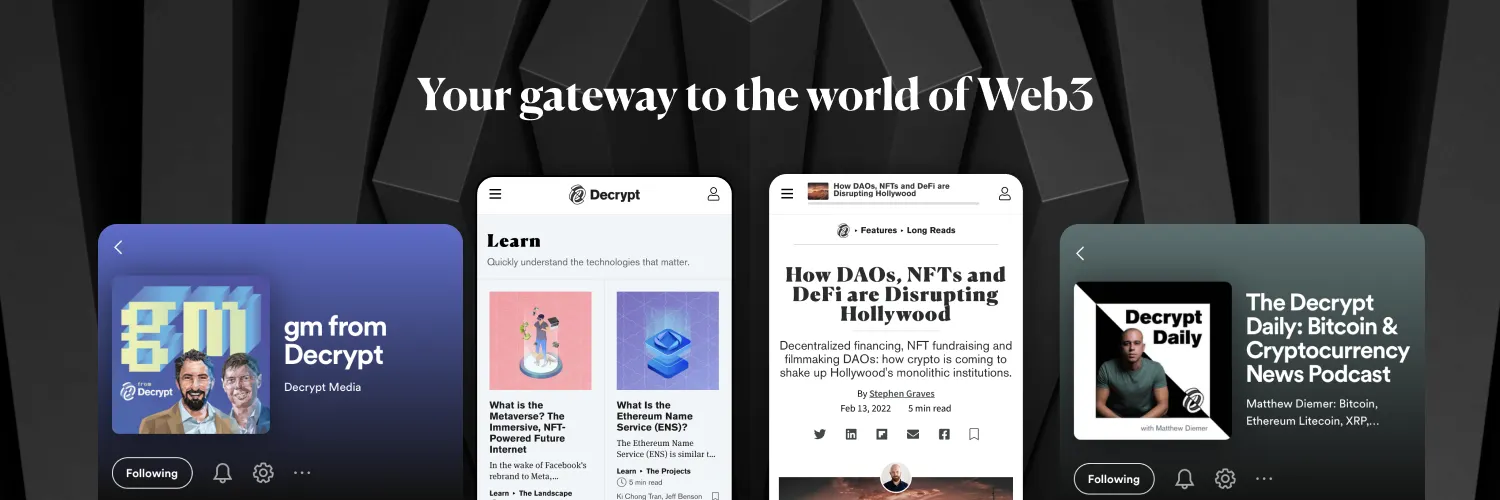 It's a pivotal time to be in the Web3 space, which is moving at breakneck pace. On our editorial side, our vision remains the same as it's always been: to demystify crypto and blockchain for readers of all understanding levels with our daily news coverage and our Learn section. We now have two high-value podcasts (our daily news digest Decrypt Daily and gm, our bi-weekly conversation with the biggest names in crypto); a daily email newsletter, weekly DeFi edition, and Saturday edition; and we hold live video roundtables and interviews.